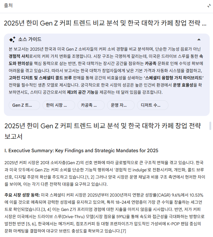 심층조사를 할 땐 막연하게 "마케팅 트렌드 조사해줘"라고 하기보다, "2025년 한국과 미국의 20대(Gen Z)가 선호하는 카페 트렌드를 비교 분석해 줘. 특히 '저가 커피'와 '스페셜티 커피' 시장의 성장률 통계 자료를 포함하고, 이를 바탕으로 대학가 카페 창업 전략을 제안해 줘."처럼 구체적인 목표(Goal)를 설정하세요. 훨씬 정교한 보고서를 얻을 수 있습니다.
